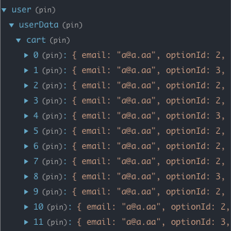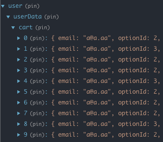 데이터가 user.userData.cart에서 순서대로 잘 들어가는 것을 확인할 수 있다