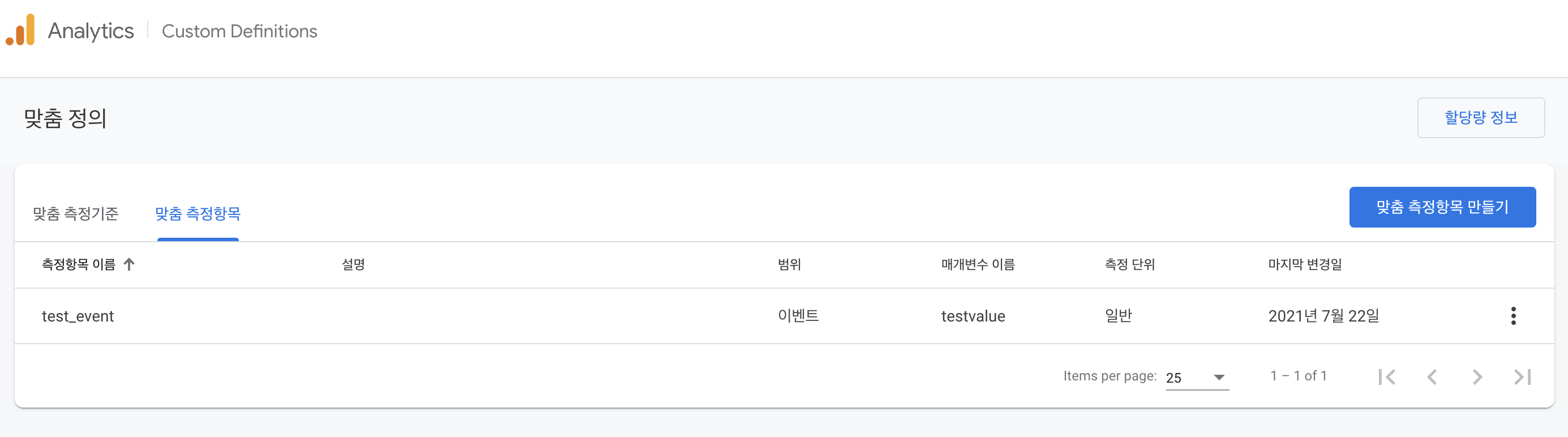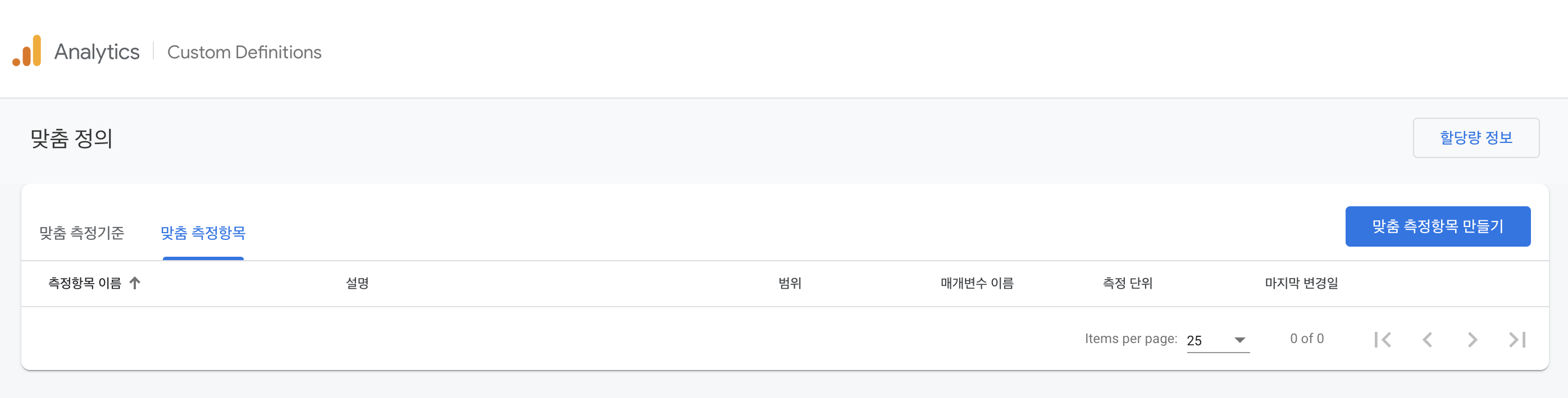 Analytics=>Custom Definitions=>맞춤 측정항목=>맞춤 측정항목 만들기