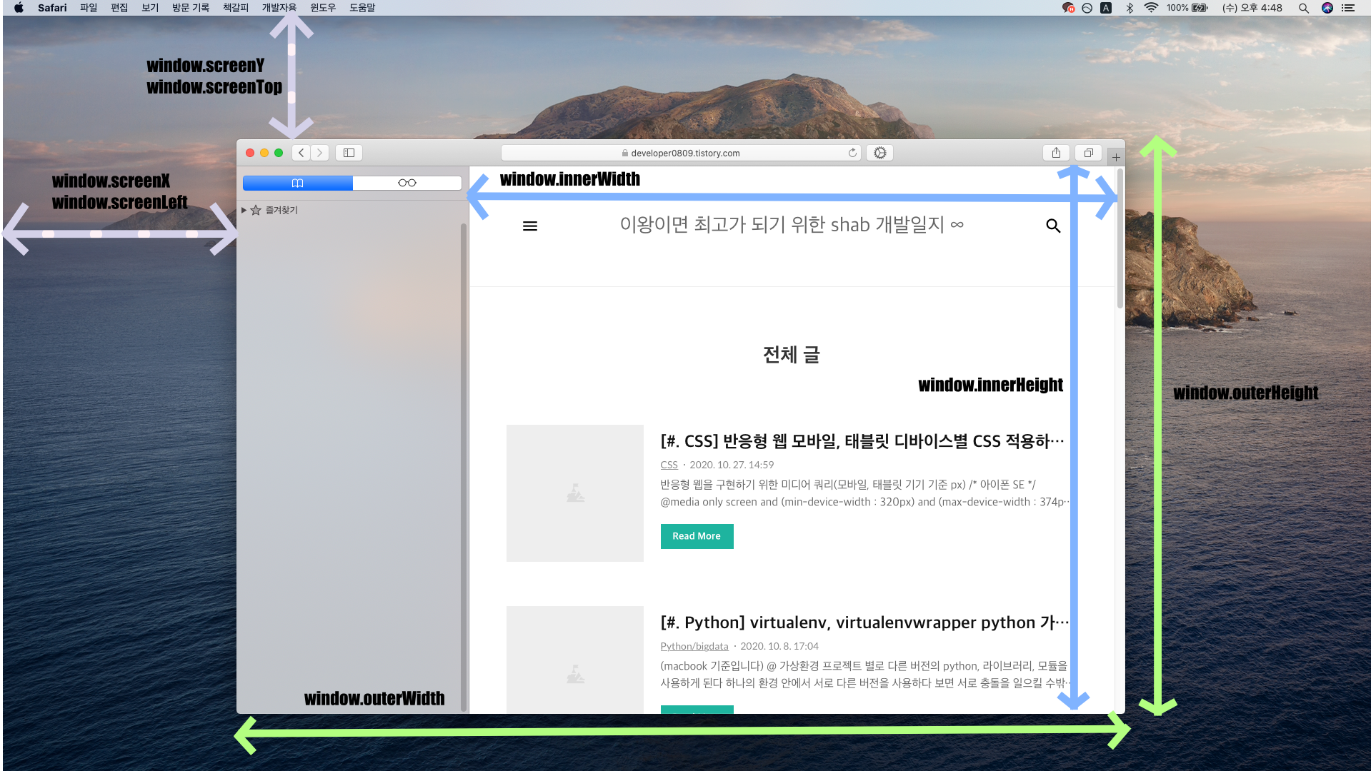 window.screenLeft : 왼쪽으로부터 브라우저 위치