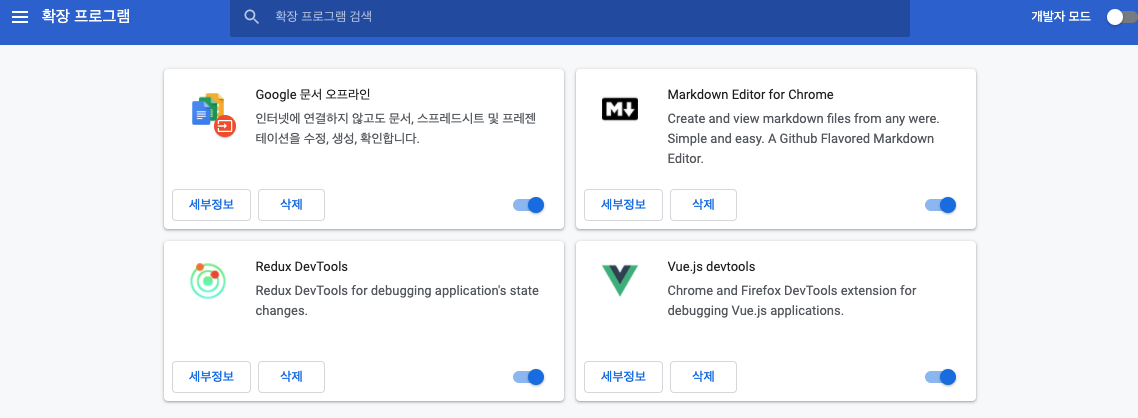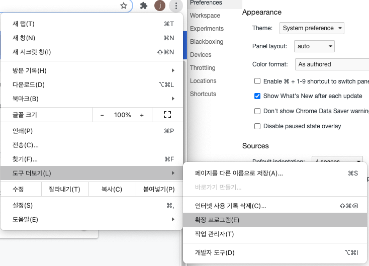 ① 크롬 브라우저 상단 : => 도구 더보기 => 확장 프로그램