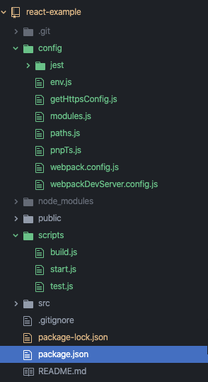이렇게 숨겨져 있던 config 폴더와 scripts 폴더가 보이고, package.json 파일에 모든 dependency 와 babel, jest 설정 코드가 드러난다